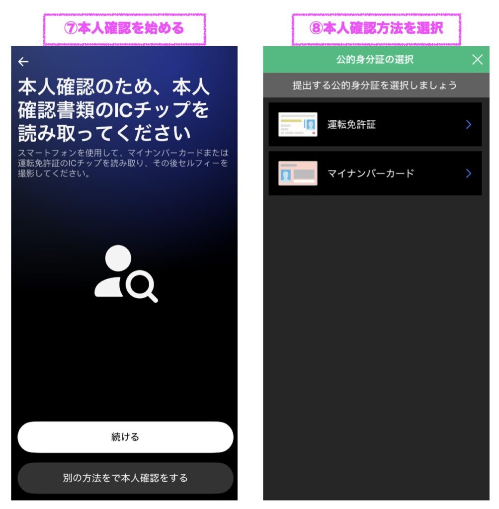⑧運転免許証かマイナンバーかどちらで本人確認をするか選びましょう